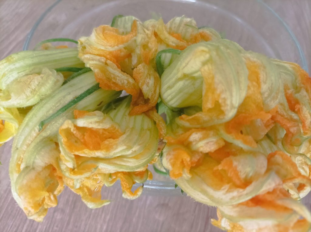 Rincez délicatement les fleurs de courgette et enlevez le pistil à la base en ouvrant complètement la fleur.