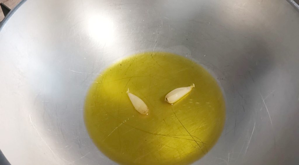 Dans la poêle, mettez de l’huile pour couvrir tout le fond et l’ail, faites chauffer.