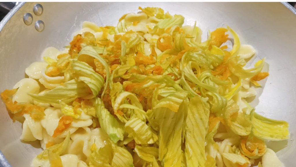 Ajoutez les fleurs et mélangez bien pendant une minute le temps que les fleurs se flétrissent, ajoutez une louche d’eau de cuisson et la crème de ricotta.