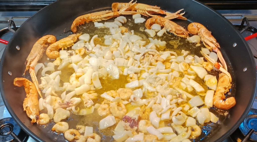 Ajoutez les crevettes, faites-les revenir et tournez les langoustines. Ajoutez les seiches et les calmars et faites revenir pendant 5 minutes.