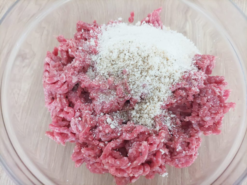 Commencez par assaisonner la viande avec du parmesan, du sel et du poivre, mélangez les ingrédients avec les mains.