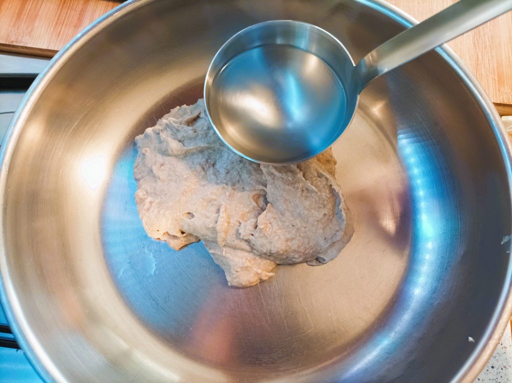Bien mélanger, ajoutez encore une demi-louche d’eau de cuisson, cela doit être crémeux, mais pas liquide. Vérifiez la cuisson et éteignez.