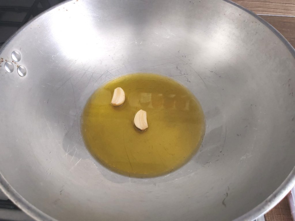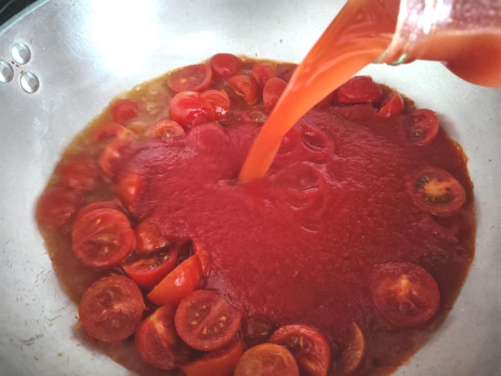 Dans une poêle, mettez de l’huile et de l’ail, faites revenir à feu moyen et lorsque l’ail est bien doré, ajoutez les tomates cerises coupées en deux et la purée de tomates, dans la bouteille de purée versez à moitié de l’eau et ajoutez-la à la tomate.