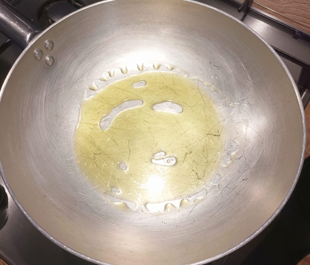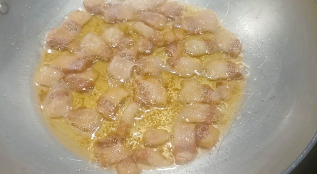 Dans la poêle, mettez l’huile, faites-la chauffer et ajoutez le guanciale, réduisez la flamme au minimum et faites-le griller patiemment sans le brûler. Pendant ce temps, mettez de l’eau dans une casserole pour cuire les pâtes.