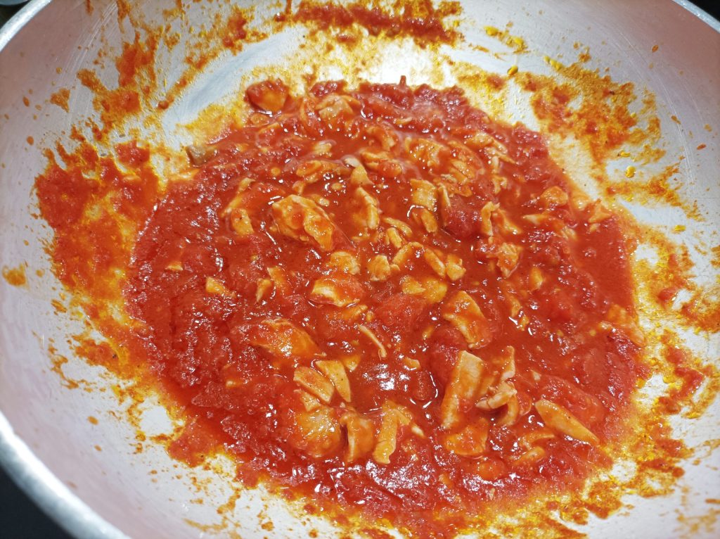 Dans le wok, mettez de l’huile pour couvrir le fond et l’ail, faites revenir et ajoutez la tomate. Faites cuire pendant 15 minutes.