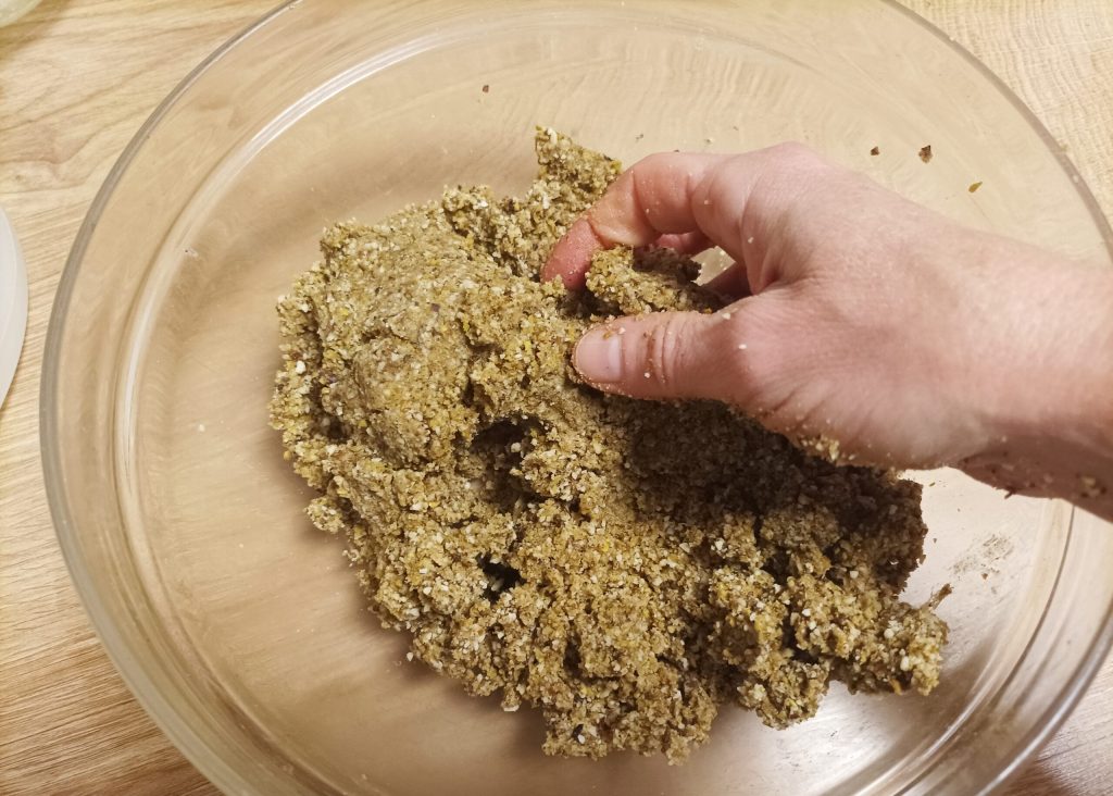 Mélangez le tout en uniformisant les farines et ajoutez le miel, puis battez un peu le blanc d’œuf et versez-le petit à petit.