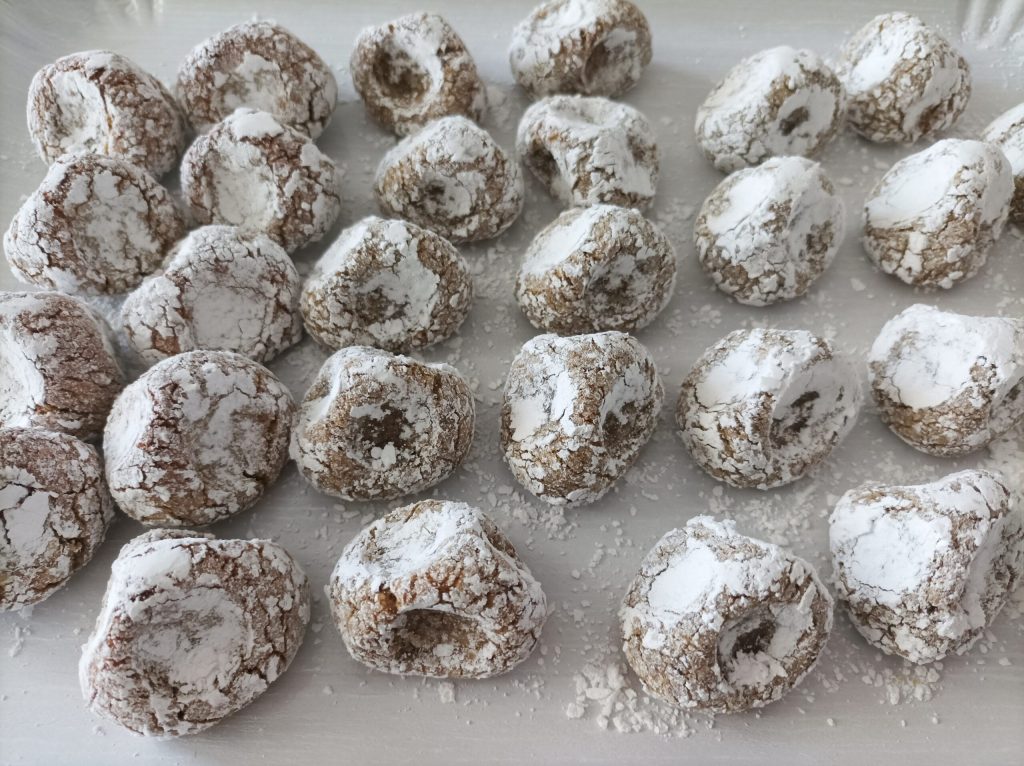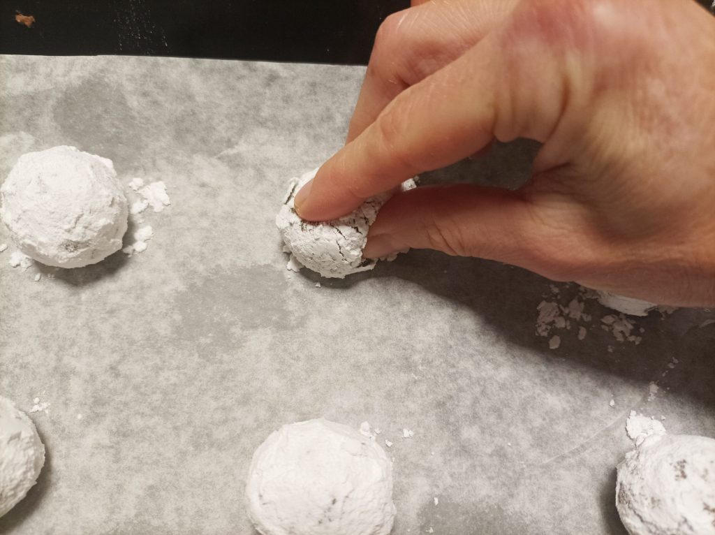 Après le temps de repos, reprenez le mélange et formez des petites boules d’environ 20 g chacune, (aidez-vous si nécessaire en saupoudrant un peu de sucre glace sur vos mains pour éviter que la pâte ne colle). Préparez un récipient avec du sucre glace et enrobez bien les boules à l’intérieur.