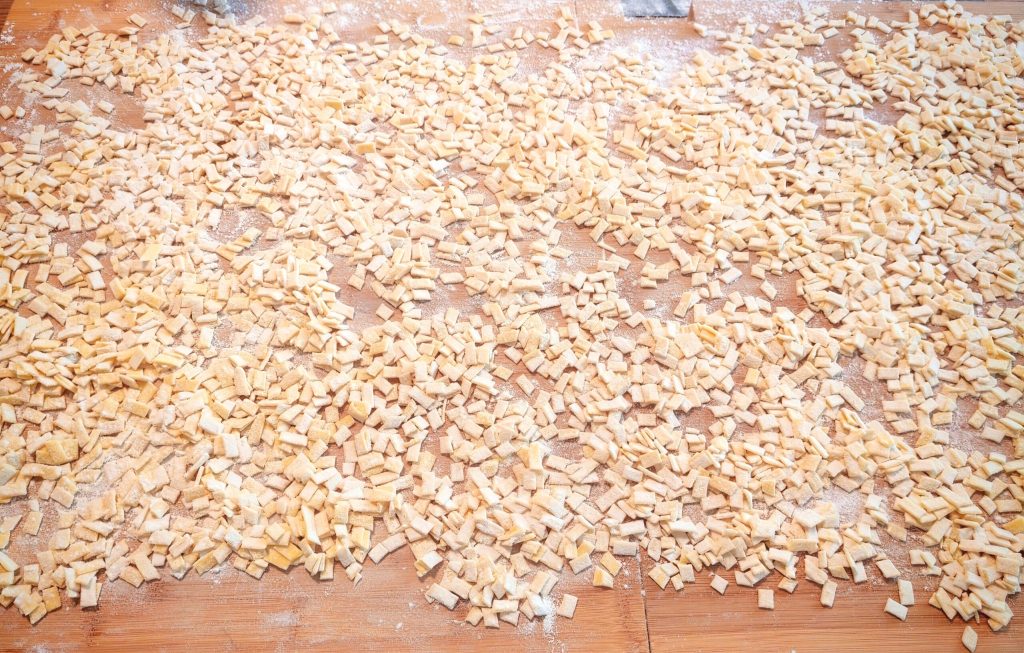 Posez-les sur une planche, saupoudrez de farine pour bien les séparer et éviter qu’elles collent, puis, avec la roulette, coupez les quadrucci. Déposez-les sur une planche ou une plaque perforée farinée et laissez-les sécher.