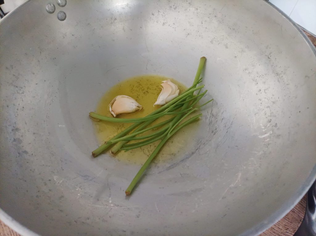 Maintenant, préparez le ragoût. Dans la cocotte, mettez de l’huile, l’ail légèrement pressé sans l’éplucher et les tiges de persil, faites revenir et ajoutez le poisson, faites dorer le tout à feu moyen pendant quelques minutes puis déglacez avec le vin en maintenant la flamme vive pour le faire évaporer, environ 5/7 minutes.