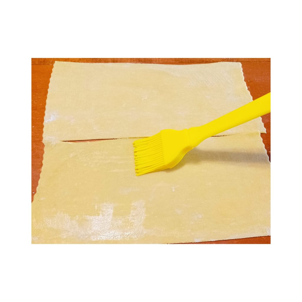 Reprenez la pâte du réfrigérateur, divisez-la en deux et commencez à étaler la pâte, ne la faites pas trop fine. Avant de commencer à remplir la pâte, badigeonnez-la avec un pinceau pour qu’il soit plus facile de la sceller.