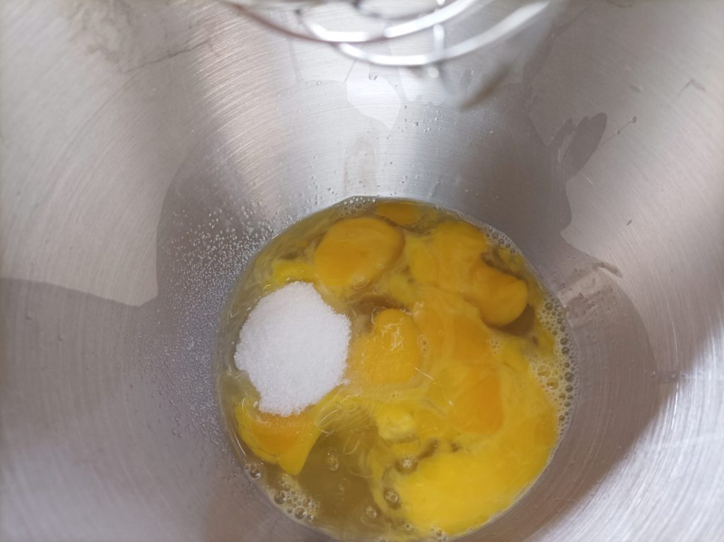 Commencez maintenant la préparation de la pâte à biscuit en battant les œufs avec le sucre pendant environ 10 minutes, puis avec une spatule ajoutez la farine petit à petit et l’extrait de vanille.