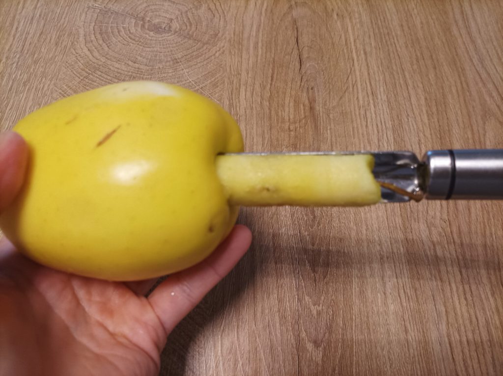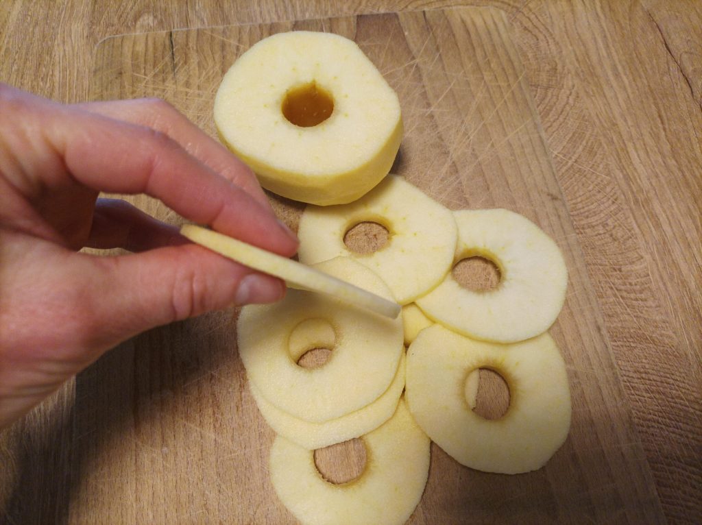 Pendant que la pâte monte, préparez les pommes. Retirez le trognon de la pomme, épluchez-la et coupez-la en tranches d’environ 3 mm.