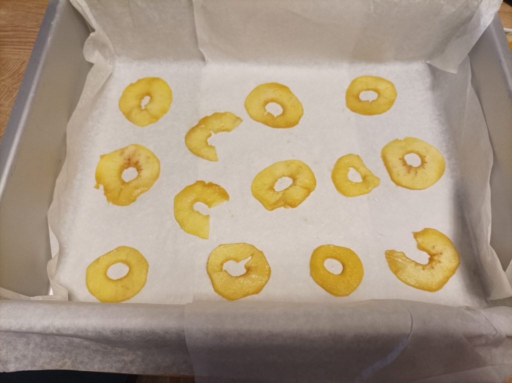 Dans la plaque ou le lèchefrite, placez du papier cuisson et disposez délicatement les tranches de pomme.