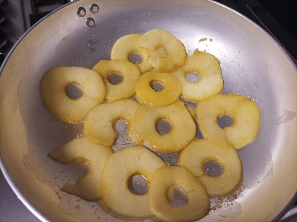 Disposez-les dans une casserole et ajoutez le sucre roux, laissez caraméliser à feu doux pendant quelques minutes. Vous verrez rapidement la pomme se flétrir, à ce moment-là, éteignez.