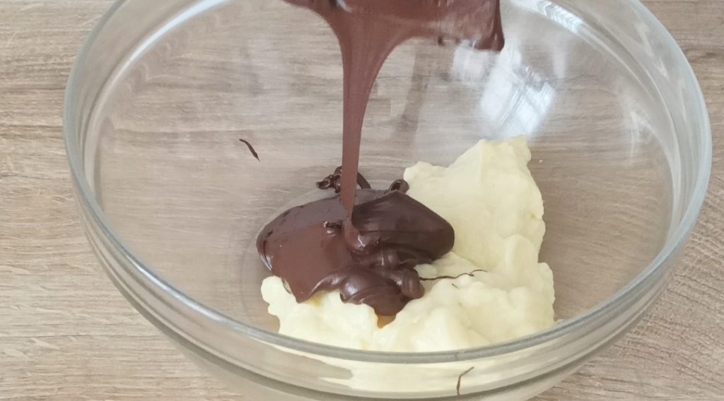 Dans un récipient, mettez la crème désormais froide, versez le chocolat fondu et mélangez.