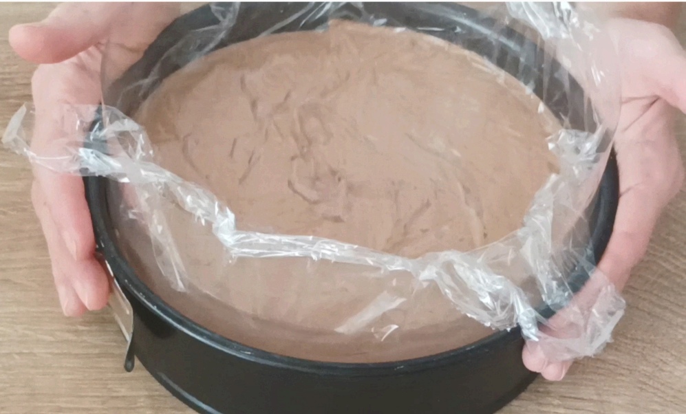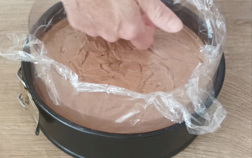 La mousse est prête. Prenez le moule ou le plateau avec un anneau et mettez autour la feuille d’acétate, versez à l’intérieur le mélange et avec une feuille de film plastique, lissez bien la surface.