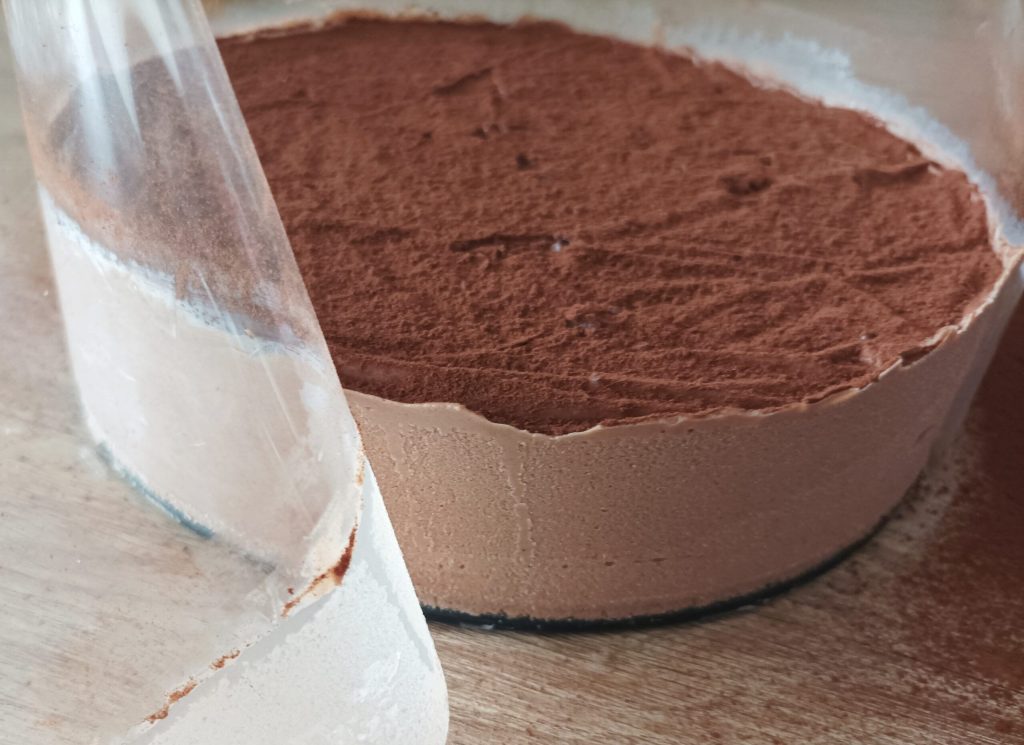 Retirez le cercle, puis enlevez la feuille d’acétate et votre semifreddo au chocolat noir est prêt à être dégusté…..