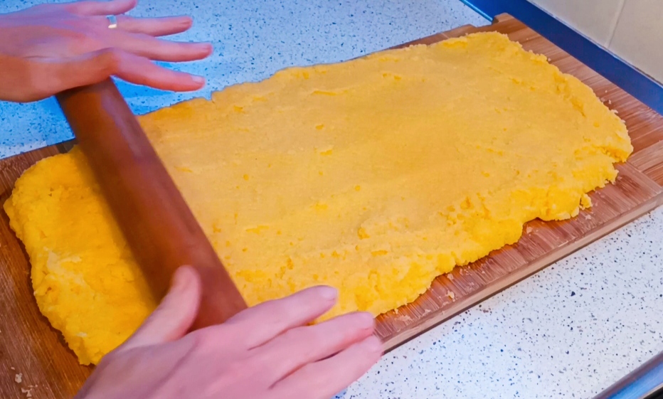 Avec un rouleau à pâtisserie, essayez de l’étaler pour la rendre plus uniforme afin que, lorsque vous la couperez, il n’y ait pas de différences d’épaisseur. Faites-la d’environ 2 cm.