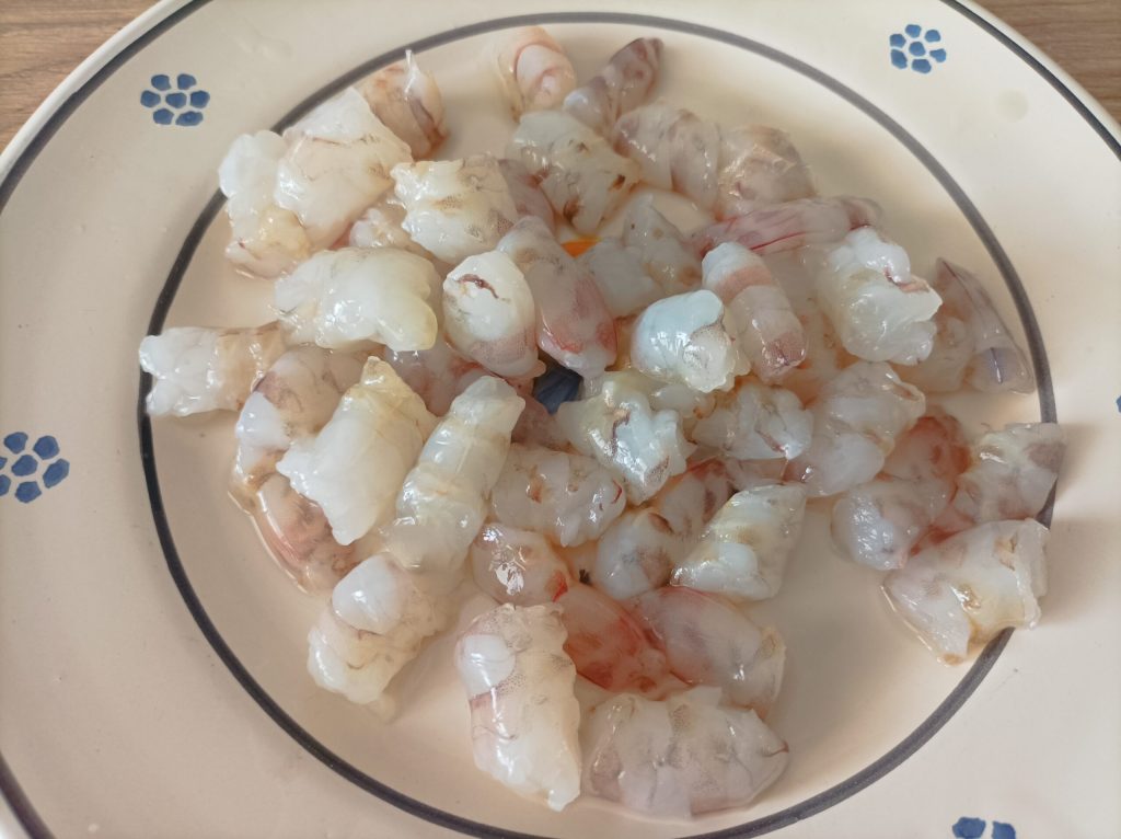 • Ensuite, coupez les crevettes royales en morceaux pas trop petits. Pendant que vous préparez la petite sauce, faites bouillir l’eau pour les spaghetti.