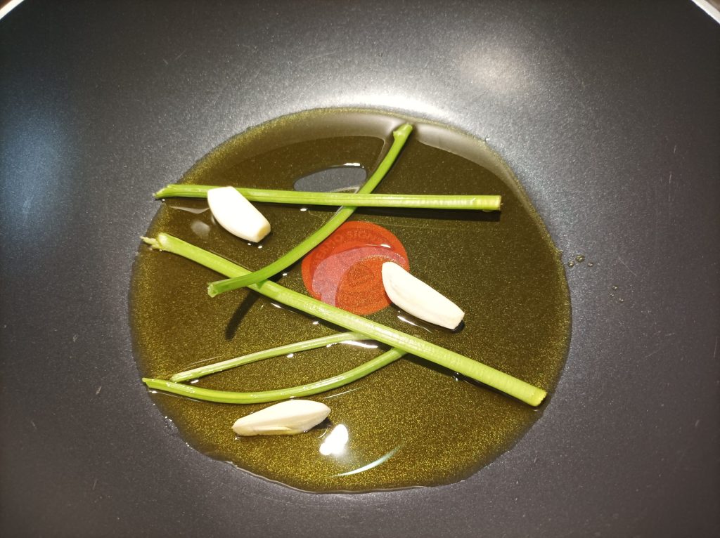 • Dans une poêle, mettez de l’huile, de l’ail et des tiges de persil, faites rissoler à feu doux pendant quelques minutes, puis ajoutez les crevettes royales et laissez dorer 1 minute, juste le temps de changer de couleur.