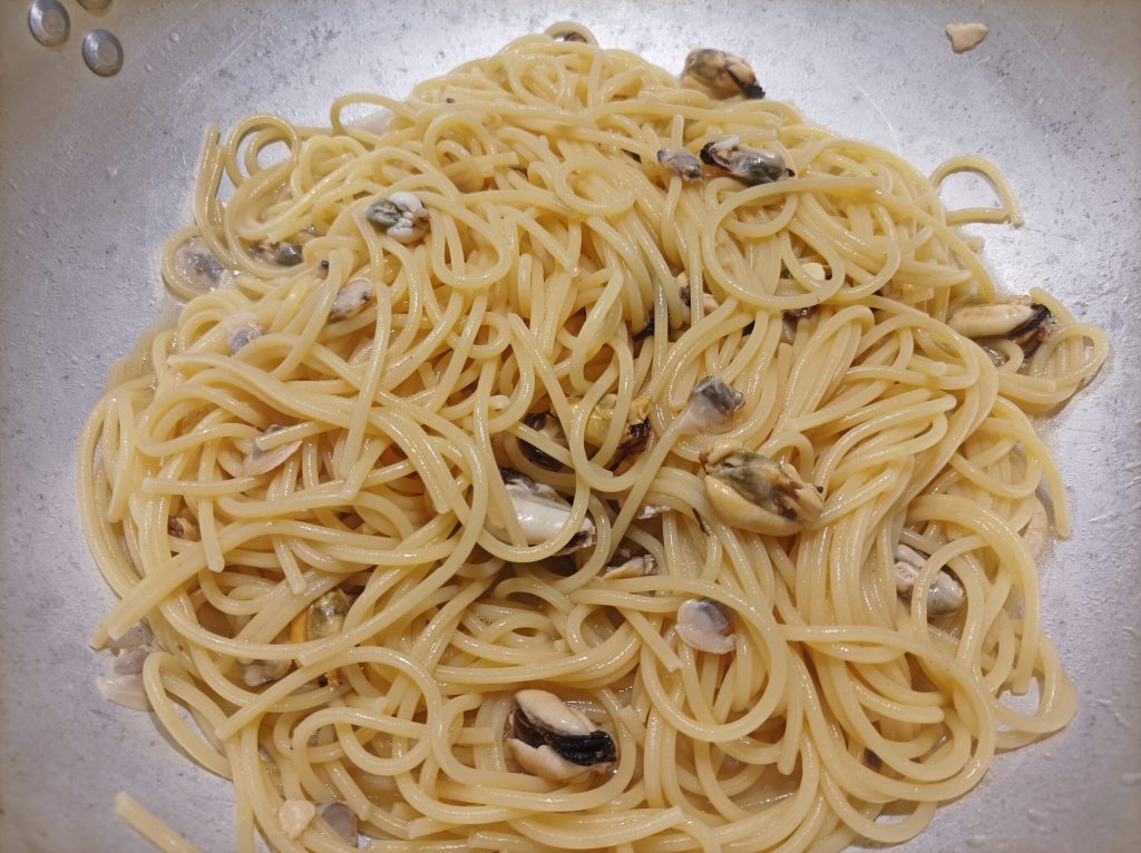 À ce point, l’eau doit bouillir, salez et mettez les spaghettoni. Faites-les cuire environ 4 minutes, puis continuez la cuisson dans le petit jus avec les moules et palourdes.
