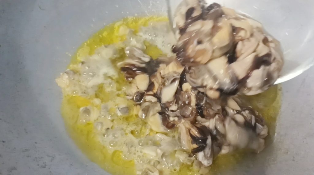 Remettez les palourdes dans la casserole, rallumez le feu et ajoutez les moules en gardant de côté leur eau.