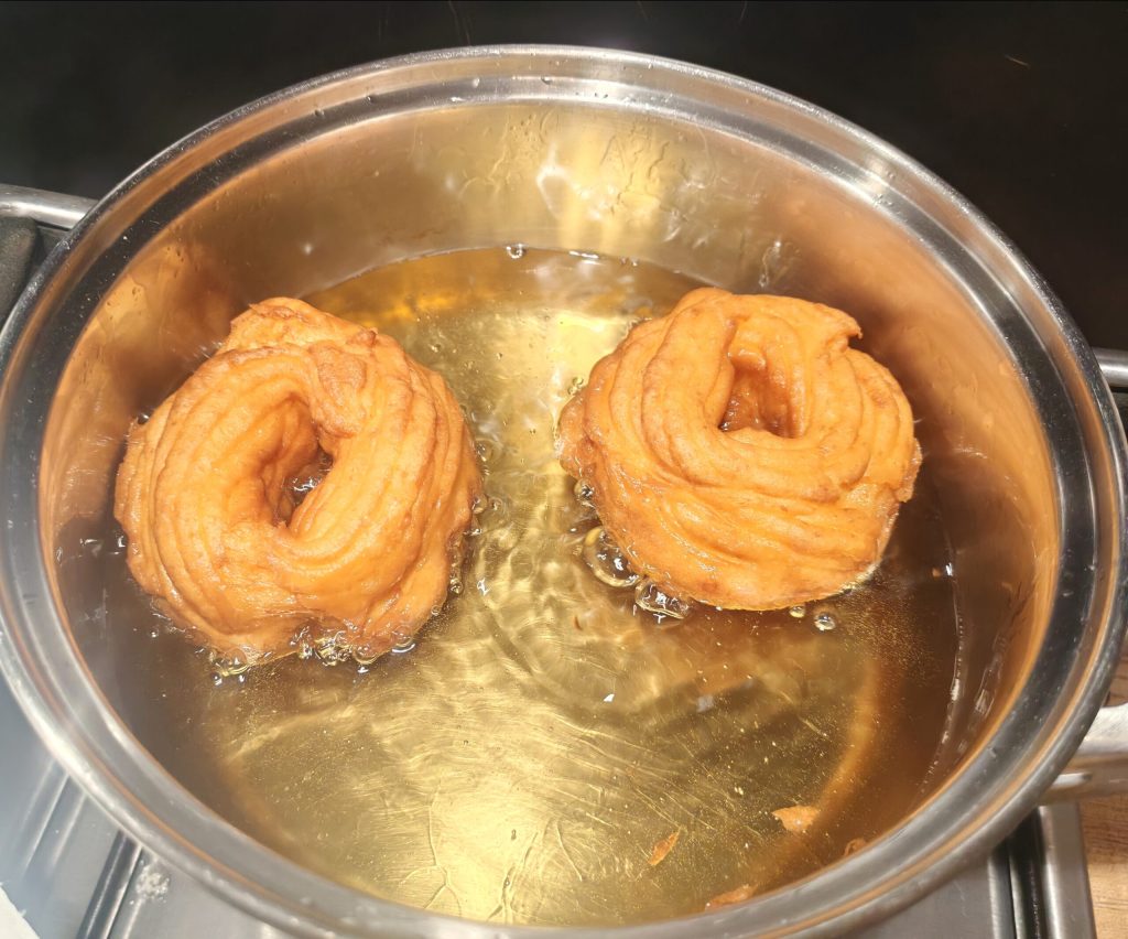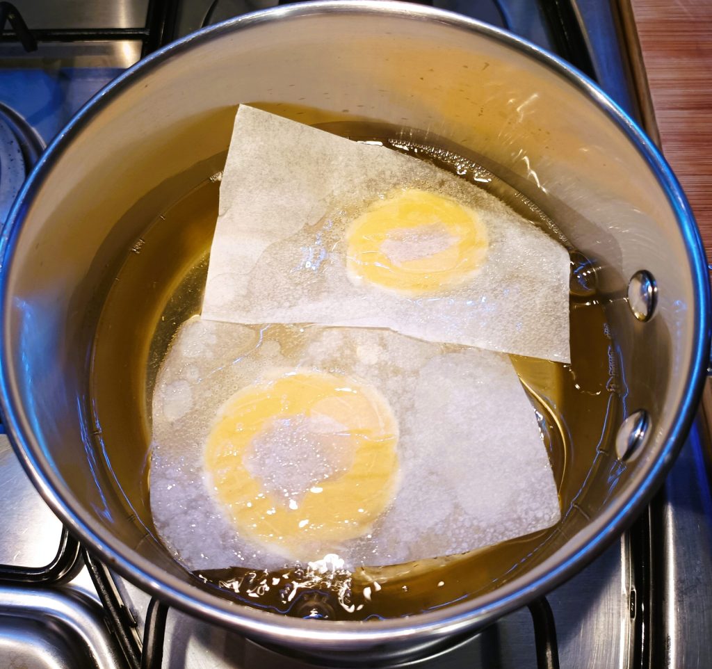 Dans une poêle, mettez de l’huile et portez-la à une température de 180°C. Insérez les zeppole avec le papier sulfurisé, quelques pièces à la fois. Faites dorer la zeppola d’un côté pendant quelques minutes, le papier se détachera tout seul, retirez-le et retournez la zeppola de l’autre côté.