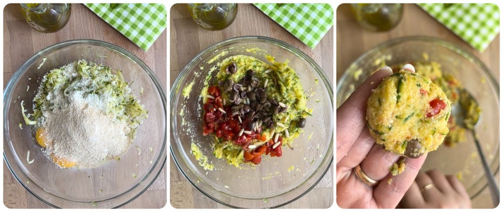 Ajoutez aux courgettes les œufs, le parmesan, la chapelure, le sel et le poivre. Mélangez une première fois et ajoutez aussi les tomates cerises coupées en petits dés, les pignons et les olives coupées en petits morceaux, si vous le souhaitez, vous pouvez également ajouter un peu de fenouil sauvage séché. Mélangez, la préparation doit être souple mais compacte. Si elle est encore trop souple pour former les boulettes, ajoutez une ou deux cuillères de chapelure. Ajustez le sel et le poivre et formez vos boulettes de courgettes savoureuses à la sicilienne.