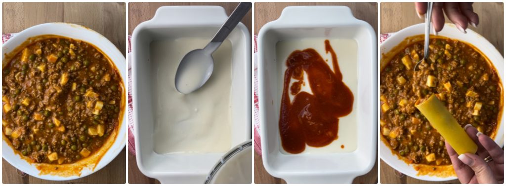 Pour avoir des cannelloni tendres, le secret réside dans la bonne consistance de la béchamel, j’ai utilisé une béchamel prête à l’emploi et je l’ai diluée avec un verre de lait, si vous la faites vous-même à la maison, il suffira d’utiliser un peu plus de lait et de ne pas cuire entièrement.