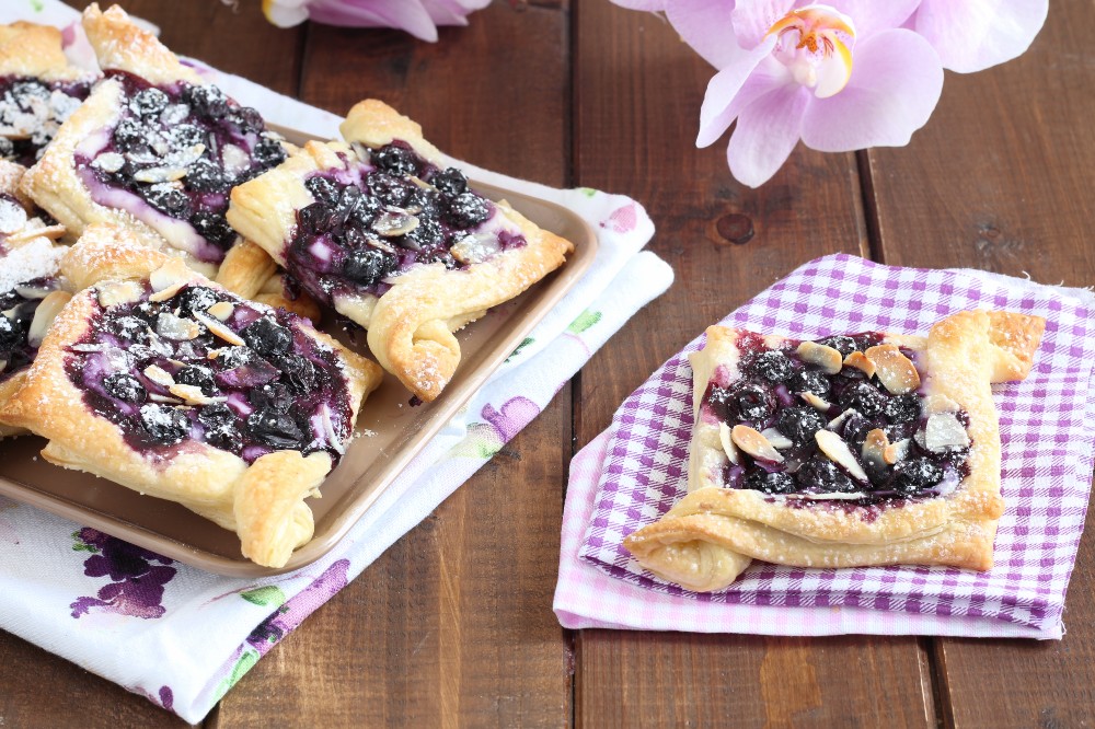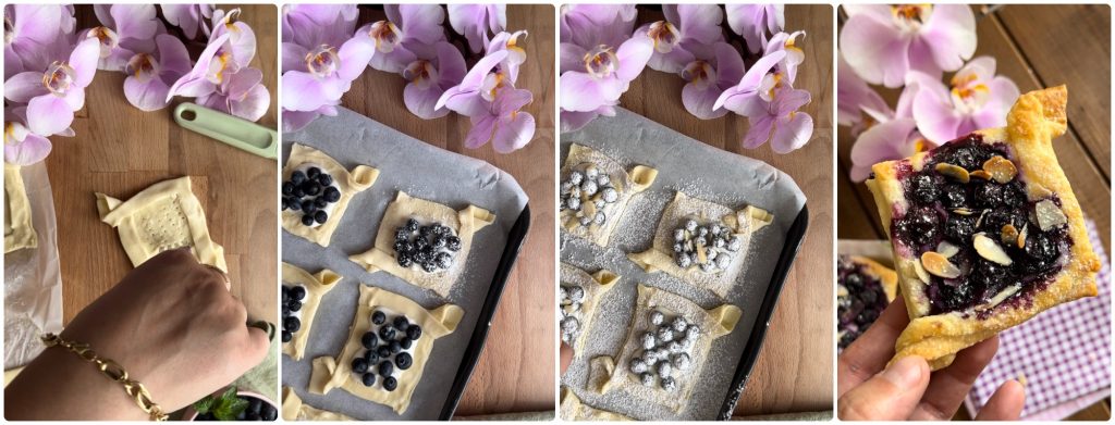 Avec la pâte feuilletée, nous simplifions notre vie, ces petits desserts avec une crème gourmande au fromage à tartiner qui ne nécessite aucune cuisson préalable et les myrtilles fraîches, nous obtenons en quelques minutes des feuilletés qui disparaîtront littéralement, une idée vraiment astucieuse et maline ! Je les prépare pour le goûter mais ils sont parfaits en toute occasion, en plus étant en portions individuelles, ils sont aussi indiqués pour des fêtes.