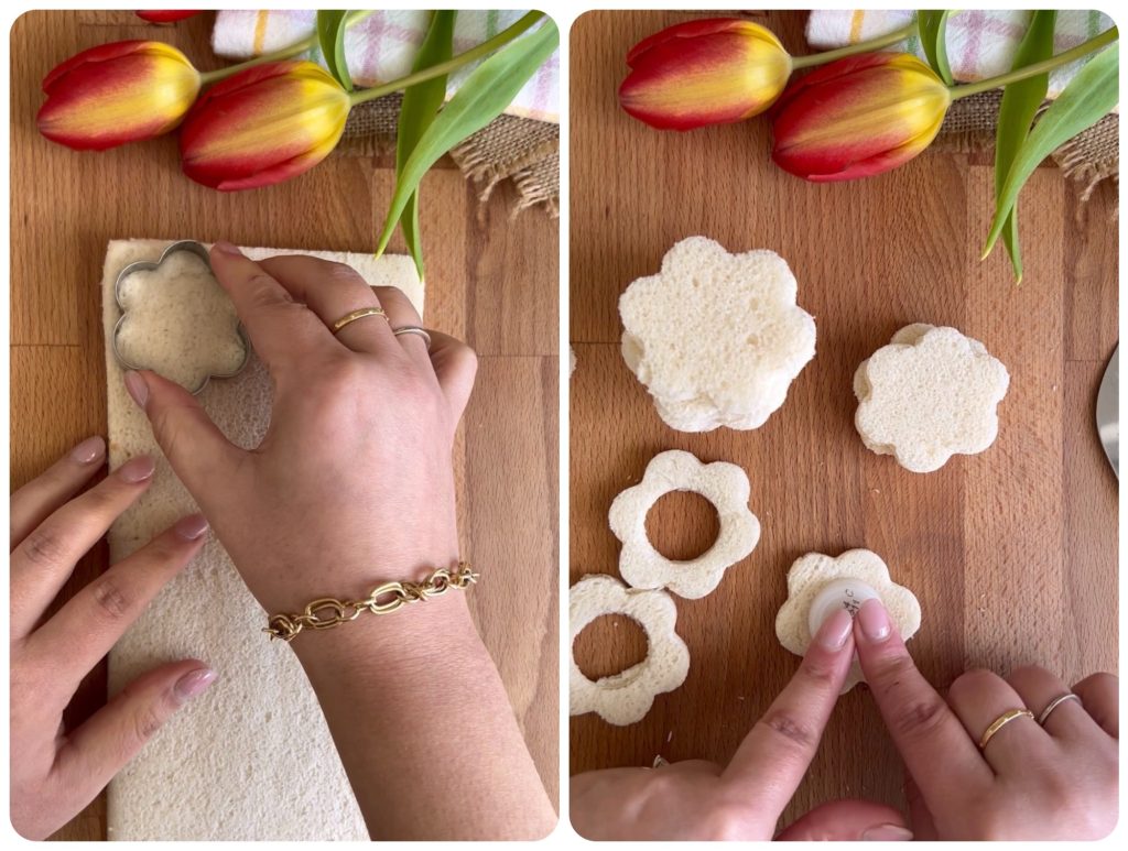 Sur la moitié d’entre elles, créez un trou central en retirant le pain blanc avec le bouchon.