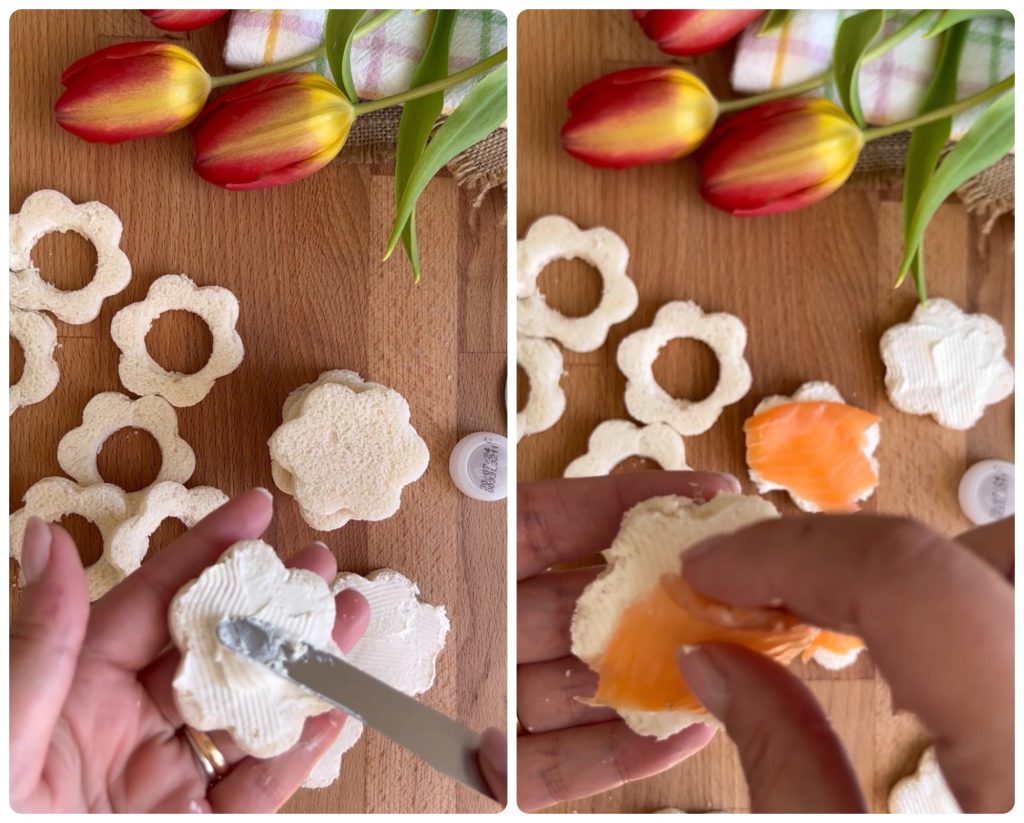 Sur les fleurs que vous utiliserez comme base, étalez le fromage doux (type Philadelphia) et ajoutez un morceau de saumon fumé, en veillant à ne pas faire sortir le saumon à l’extérieur.