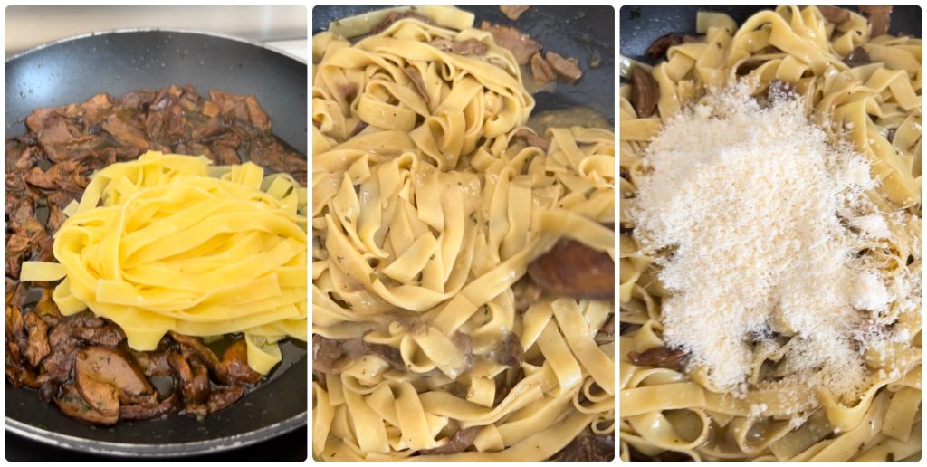 • Pendant ce temps, faites cuire les tagliatelles, à mi-cuisson ajoutez-les aux champignons et commencez à mélanger, si vous êtes doués, même à les faire sauter dans la poêle, ajoutez progressivement de l’eau de cuisson et continuez à mélanger.