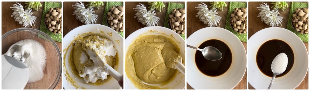Dans un bol, mets les jaunes d’œufs et 120 g de sucre, mélange rapidement avec les fouets électriques jusqu’à obtenir un mélange mousseux et clair. Ajoute lentement le mascarpone en continuant de mélanger, puis ajoute aussi la crème de pistache. Mélange jusqu’à ce que la crème soit bien homogène.