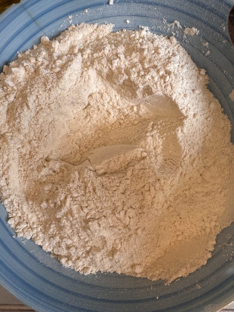 Dans un saladier, tamiser et mélanger la farine aux céréales anciennes Gentilini, la farine d’épeautre La Turchina et la farine de force.