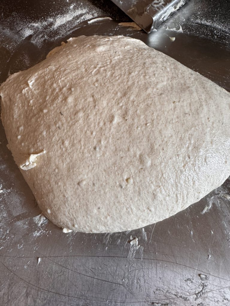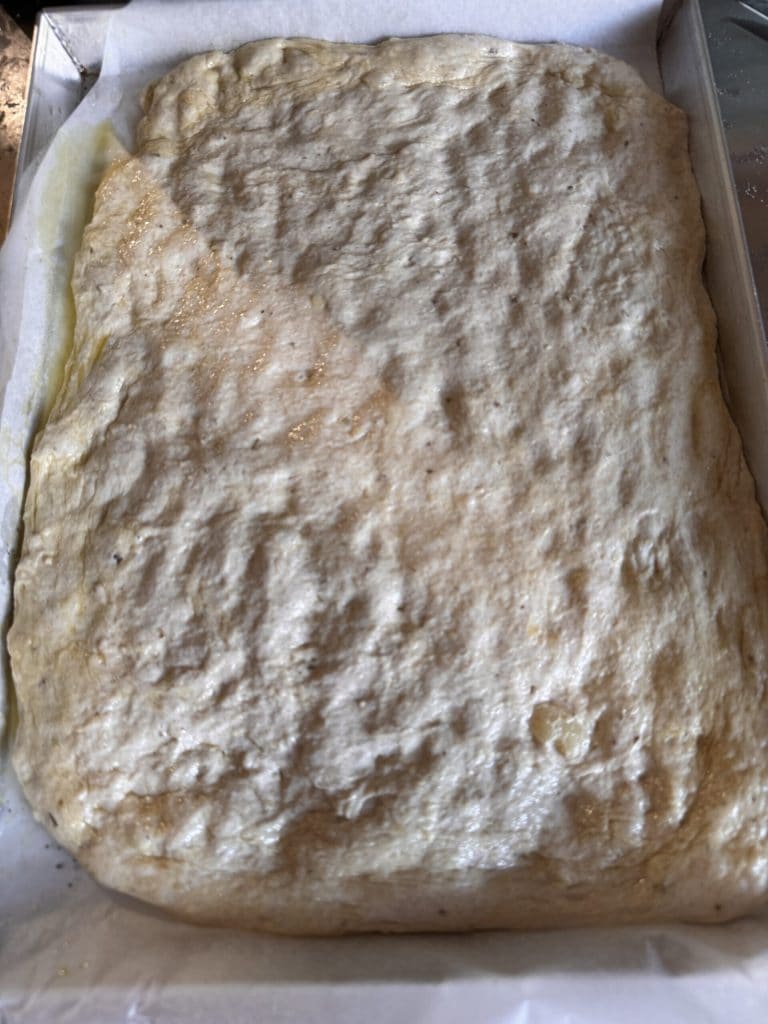 Le lendemain, sortir du réfrigérateur la pâte de la focaccia aux céréales anciennes et épeautre. La laisser s’acclimater et croître avant de commencer l’étalage. Commencer sur le plan de travail, de manière très délicate. La couvrir avec le film plastique et un torchon et la laisser se détendre