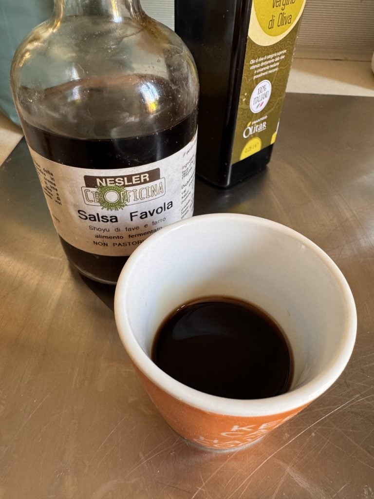 Pour les Pommes de terre, commencer par préparer dans un petit bol un mélange entre huile Olitar et sauce shoyu Favola, en les mélangeant de manière à réaliser une émulsion.
