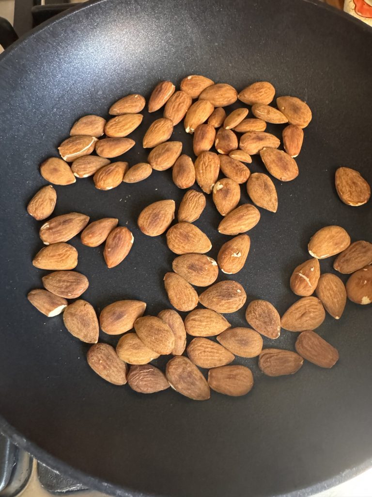 Dans une poêle bien chaude, toaster les amandes du Consortium ortofrutticolo de Tarquinia, en faisant attention à ne pas les brûler.