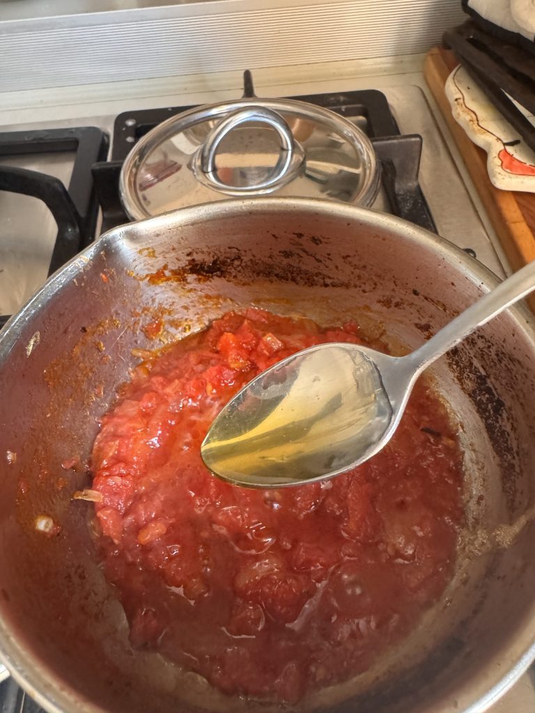 Ajouter la sauce tomate à l’ail doré et laisser cuire 5/7 minutes.