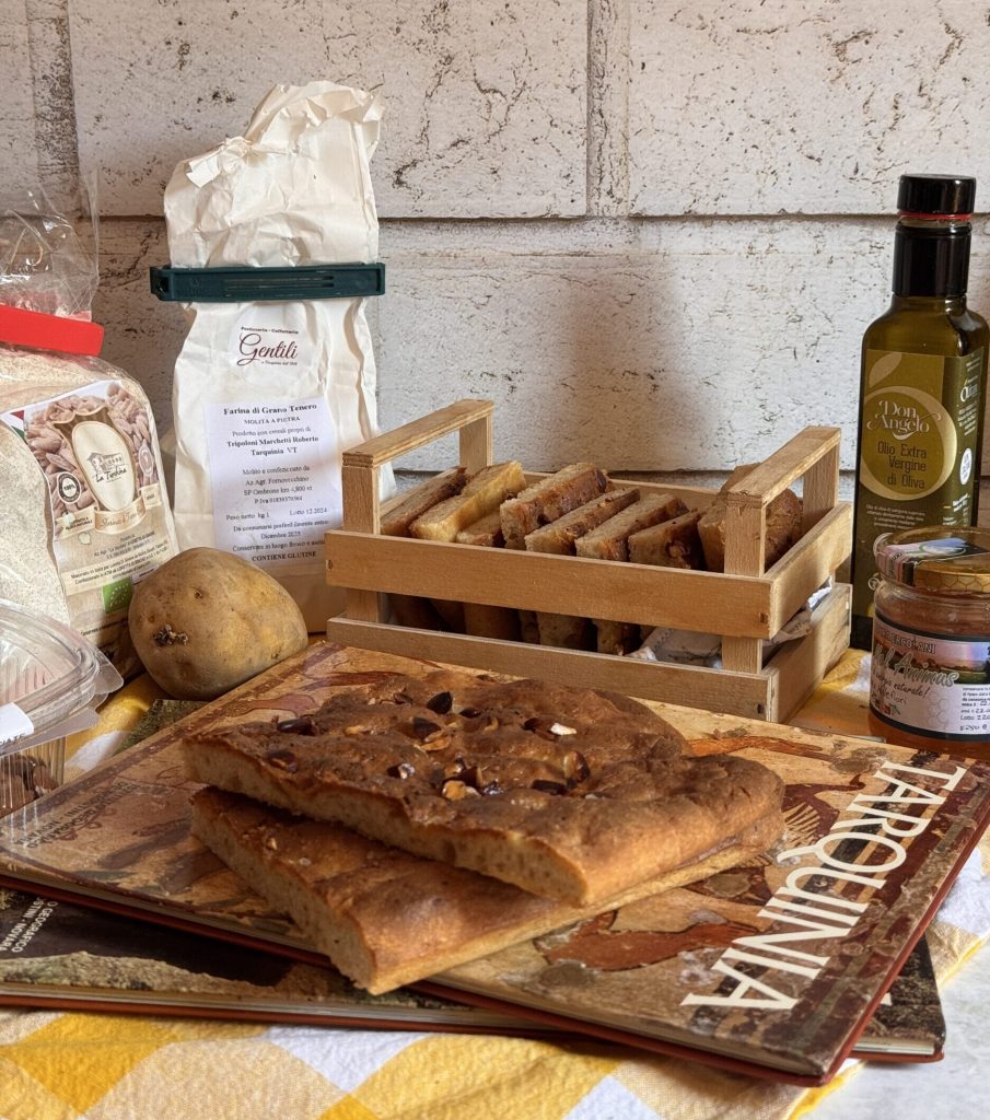 Presque tous les ingrédients de cet apéritif étrusque proviennent du territoire de la Tuscia. La focaccia est préparée avec de la farine de céréales anciennes et de la farine d’épeautre, toutes deux moulues sur pierre pour préserver toutes les caractéristiques nutritionnelles et organoleptiques des grains. À la pâte contribuent des pommes de terre, de l’huile d’olive extra vierge et du miel, qui donne une délicate note sucrée, tandis qu’en surface, le croquant est donné par les amandes locales.