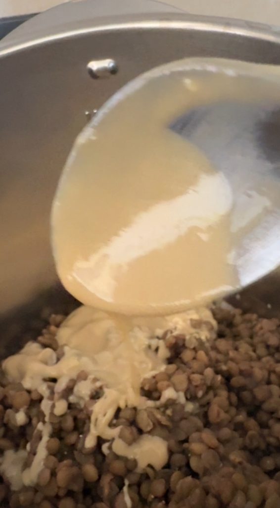Les égoutter très bien en gardant un peu d’eau de cuisson de côté.Transférer les lentilles dans le mixeur (moi dans le Bimby).