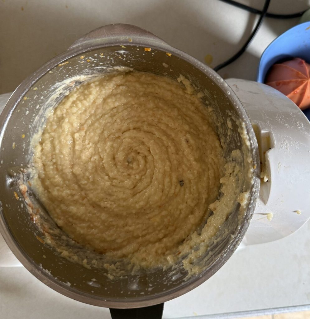 • Ajoute la farine au mélange et amalgame bien. Puis incorpore le Vin Santo délicatement. J’ai utilisé la fonction inverse du Bimby, qui ne défait pas les ingrédients. Si ton robot n’a pas cette fonction, transfère tout dans un bol et amalgame avec une maryse.