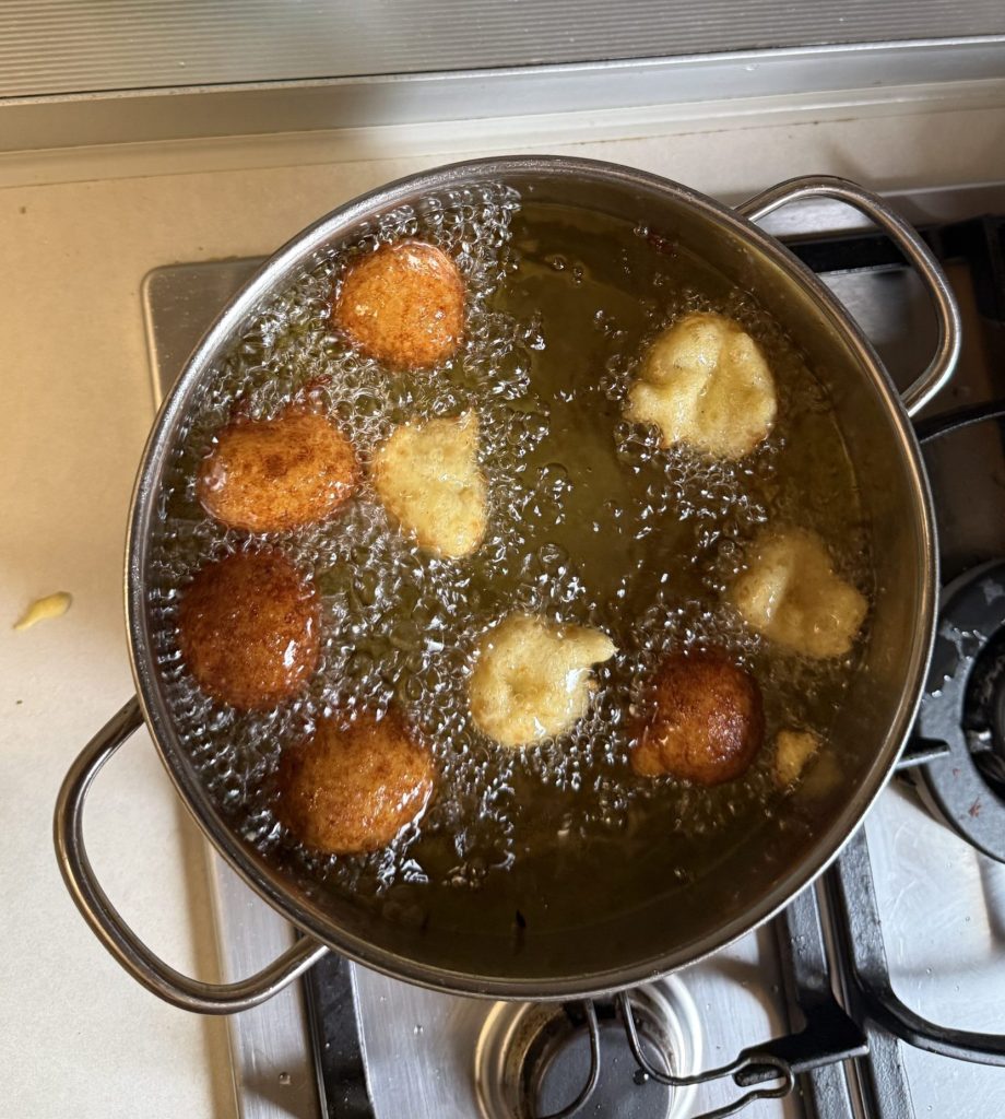 • Quand l’huile est prête, prends une demi-cuillère de pâte et fais-la glisser dans l’huile à l’aide d’une petite cuillère. Fais cuire peu de beignets à la fois (environ 6–7) et dore-les sur toutes les faces. Au fur et à mesure que tu retires les premiers, ajoute d’autres portions de pâte, ainsi tu auras toujours des beignets en cuisson.