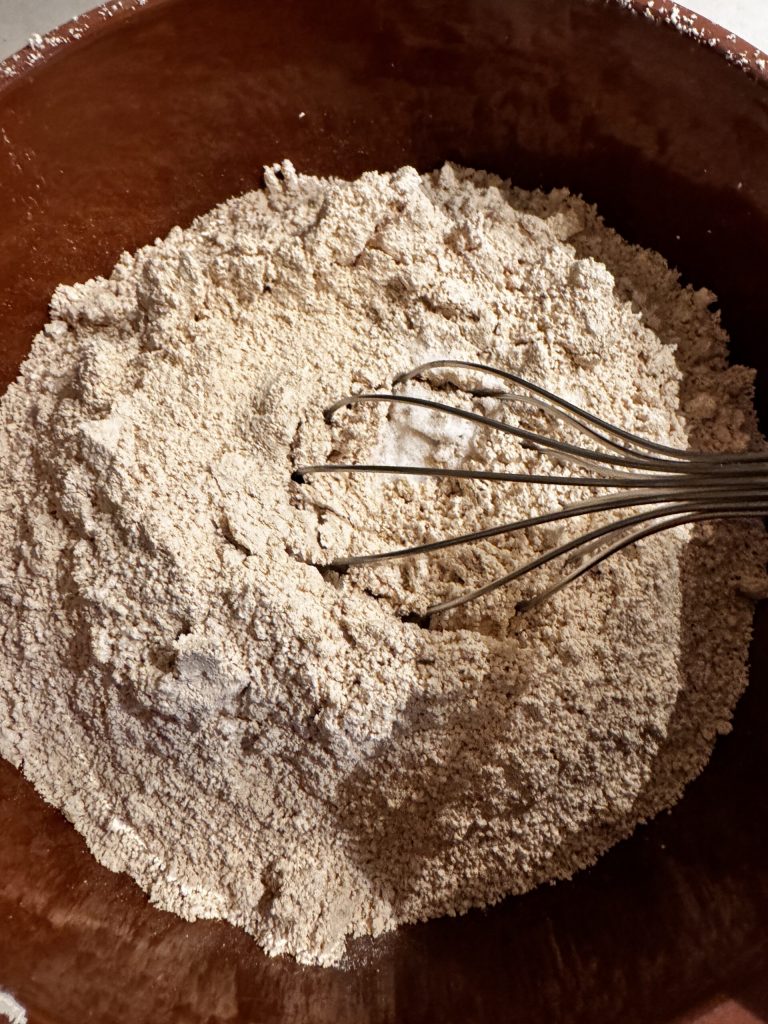 Dans un bol, tamisez la farine avec une passoire. La farine de châtaignes est très dense, il peut donc être nécessaire de s’aider d’une cuillère. Mais cette étape est vraiment importante car elle minimise le risque des grumeaux en aérant la farine.