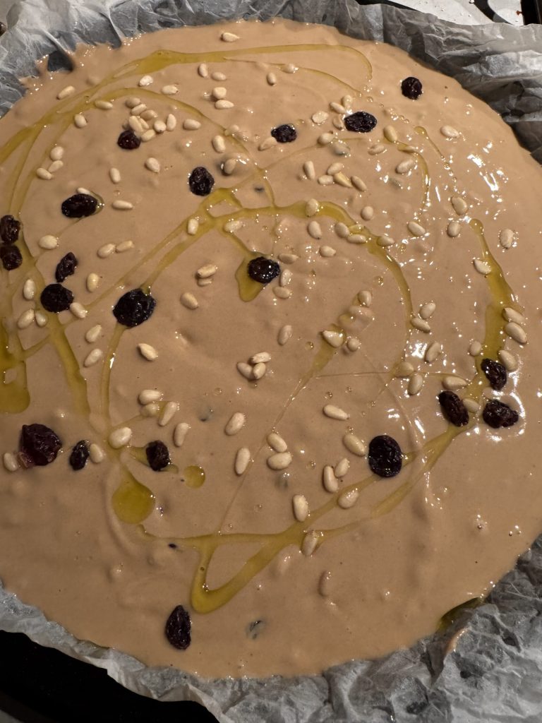 La liste des ingrédients nécessaires pour faire le castagnaccio est vraiment courte : eau, huile, raisins secs, pignons et farine de châtaignes ! Cette dernière est typique de l’Appennin tosco-émilien et est une farine très dense, qui absorbe beaucoup d’eau. Et très souvent, elle varie d’un producteur à l’autre. C’est pour cela que de nombreuses recettes sont faites « à l’œil » en ce qui concerne l’hydratation. Je vous expliquerai au fur et à mesure des astuces pour pallier ce « problème ».