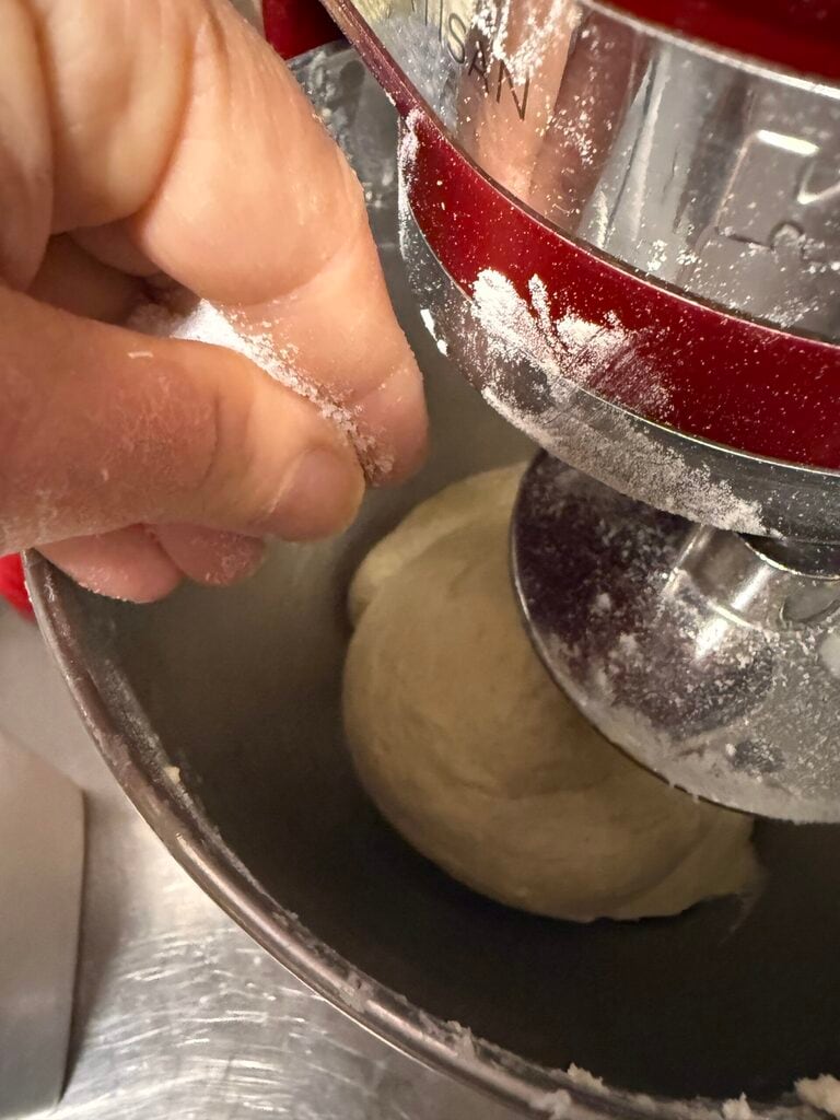 Continuer à ajouter alternativement la farine et les liquides. Une fois terminé, placer le crochet et pétrir la pâte, qui s’enroulera autour du crochet en laissant les parois propres.