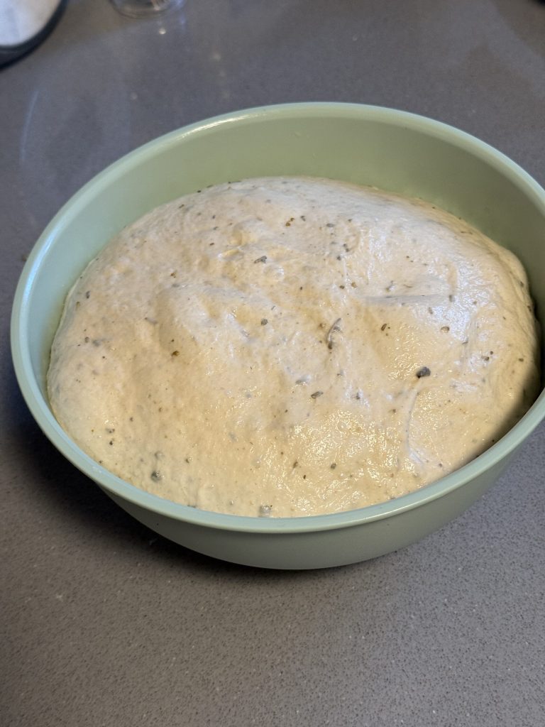 Dissolvez le sel dans l’eau mise de côté et ajoutez-le à la pâte, en attendant qu’il soit entièrement absorbé. Ajoutez ensuite les herbes aromatiques : j’ai utilisé du romarin, de la sauge et de l’aneth sauvage de mon potager, séchés et hachés de façon irrégulière.