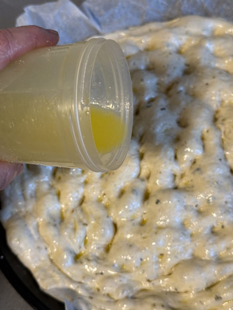 Préparez la salamoia : dans un flacon de cuisine ou un récipient fermé, versez eau, huile d’olive extra vierge et sel et secouez jusqu’à obtenir une belle émulsion. Versez-la généreusement sur toute la surface de la focaccia.