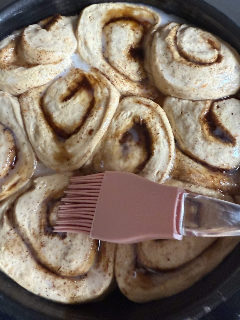 Lorsque les spirales ont presque doublé de volume, préchauffez le four à 180°C. Avant d’enfourner, badigeonnez délicatement la surface avec un peu de boisson aux amandes pour obtenir une cuisson uniforme et une dorure légèrement brillante.