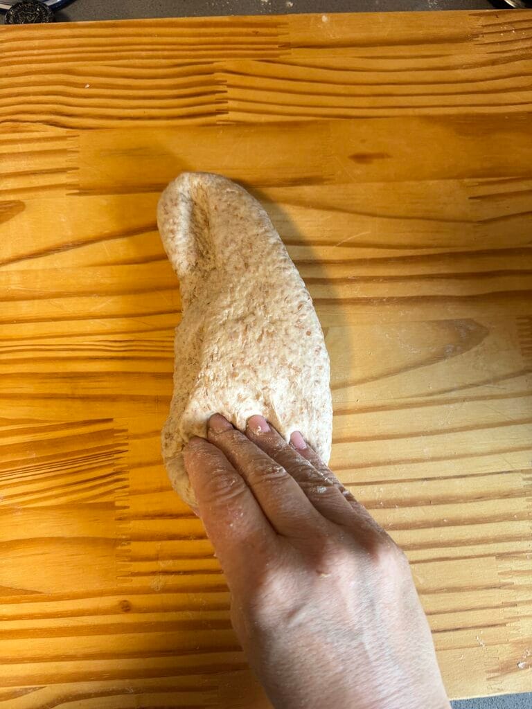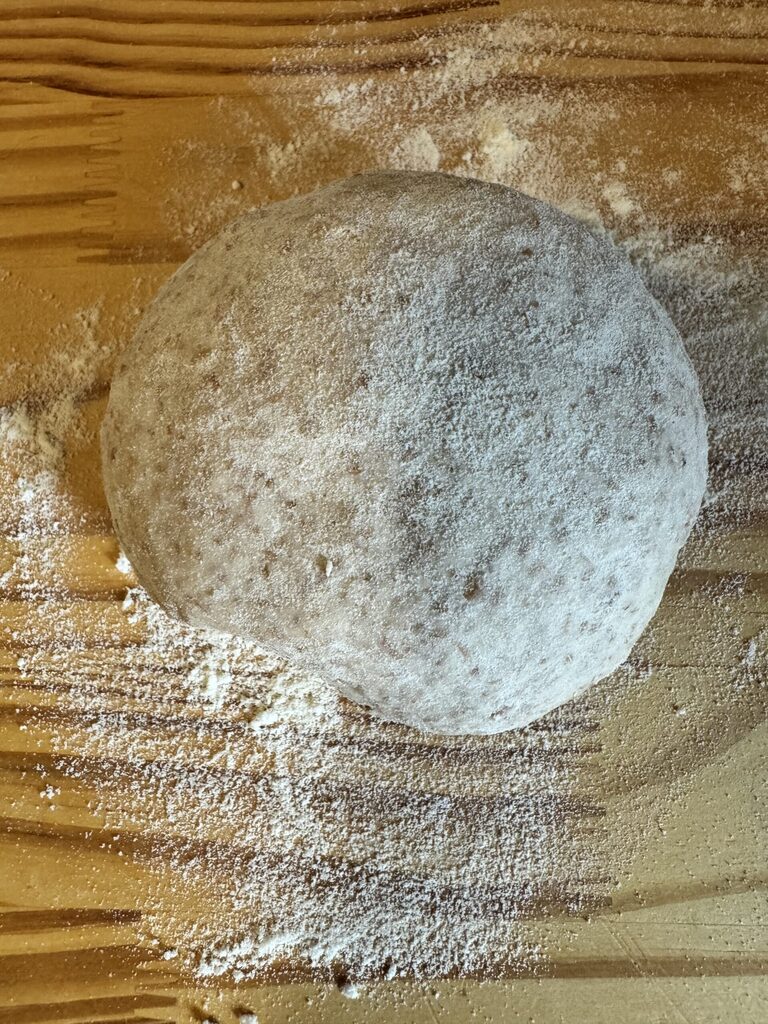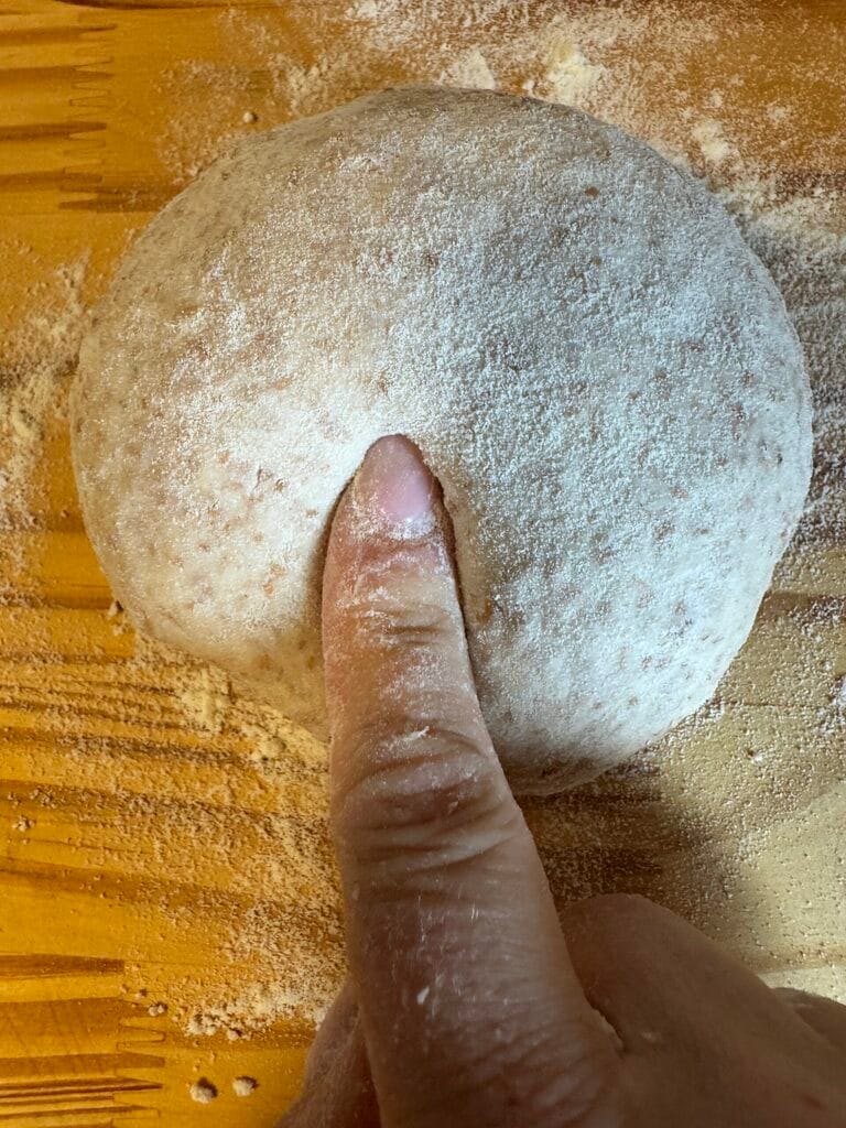 Après le temps de repos sous le bol, la pâte des malfatti complets sans œufs sera douce et élastique, prête à être étalée.